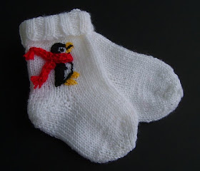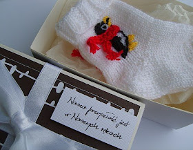 Pare dni temu dostałam maila z prośbą o wykonanie skarpetek z pingwinkiem. Miały to być skarpetki dla niemowlaka i miały mieć charakter symboliczny bo zamówił je Pan, który chce je wręczyć na znak, że to już odpowiedni moment by "stworzyć" potomka :) Skarpetki powstały a Maugo dorobiła do nich pudełeczko.